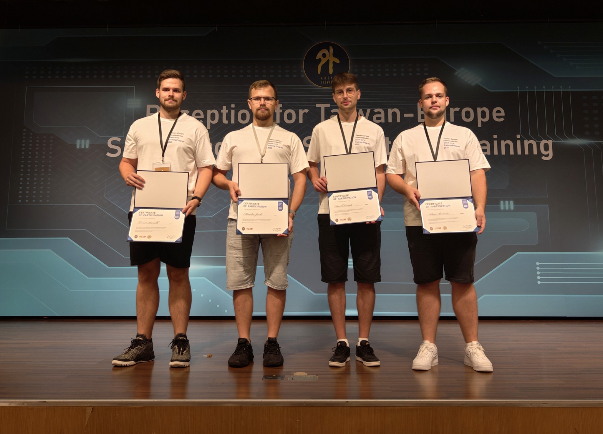Naši študenti úspešne absolvovali prestížny Taiwan-Europe Semiconductor Short-term Training Program 2025, kde si rozšírili vedomosti v oblasti polovodičových technológií a nadviazali kontakty s odborníkmi. Srdečne gratulujeme a prajeme veľa ďalších úspechov. Na fotke zľava: Tomáš Kanálik, Miroslav Jusko, Pavol Horňak a Adam Bodnár.