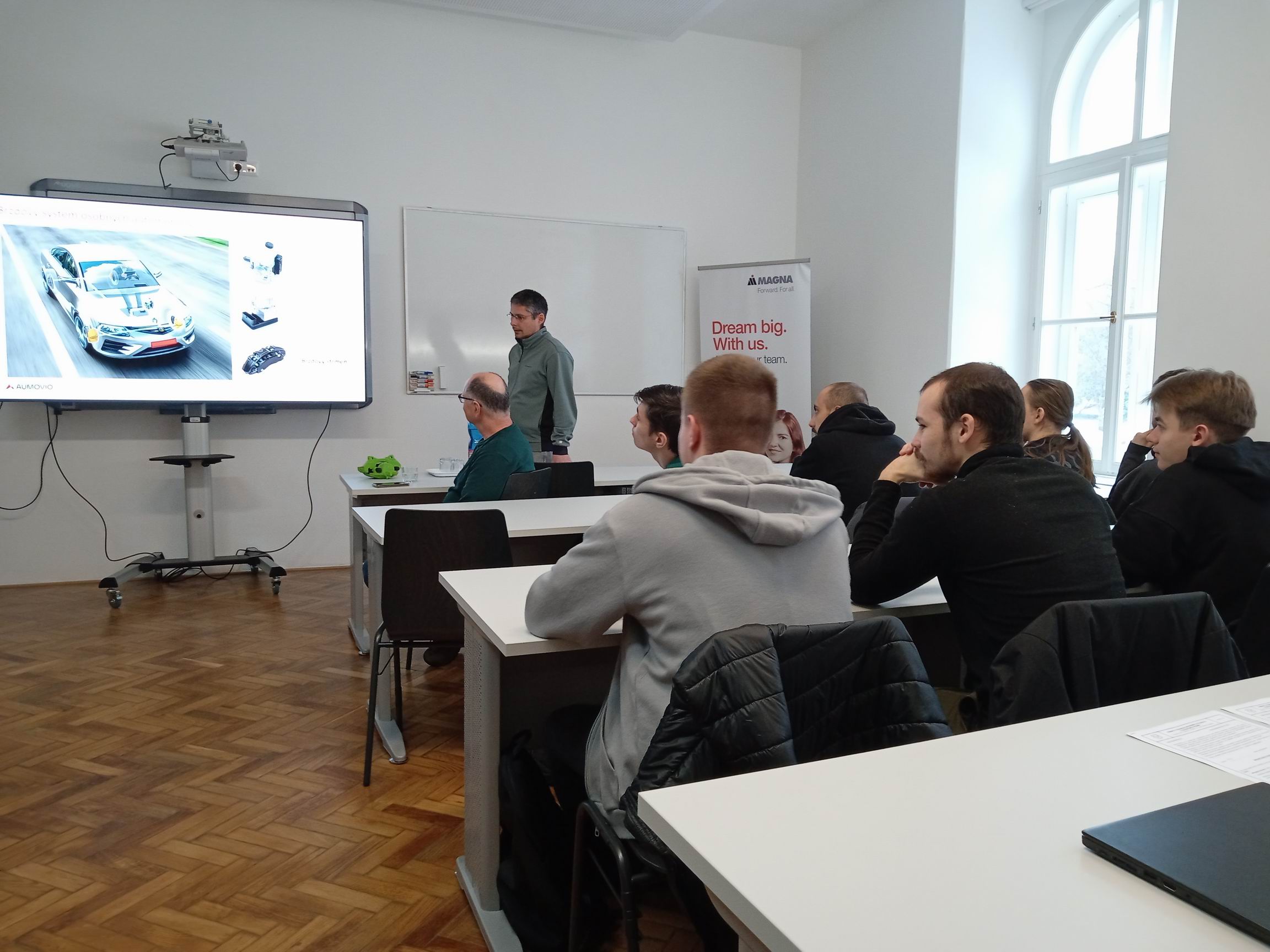 24. 11. 2025 sa pre študentov inžinierskeho štúdia uskutočnila odborná prednáška na na témy EPB brzda a dynotesting, ktorú viedli zástupcovia spoločnosti Aumovio.